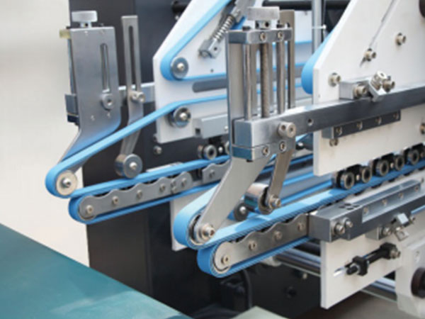 本折部 本折配有上傳動(dòng),折紙皮帶糾正功能, 加長工作部,使盒子成型更加穩(wěn)定 |
